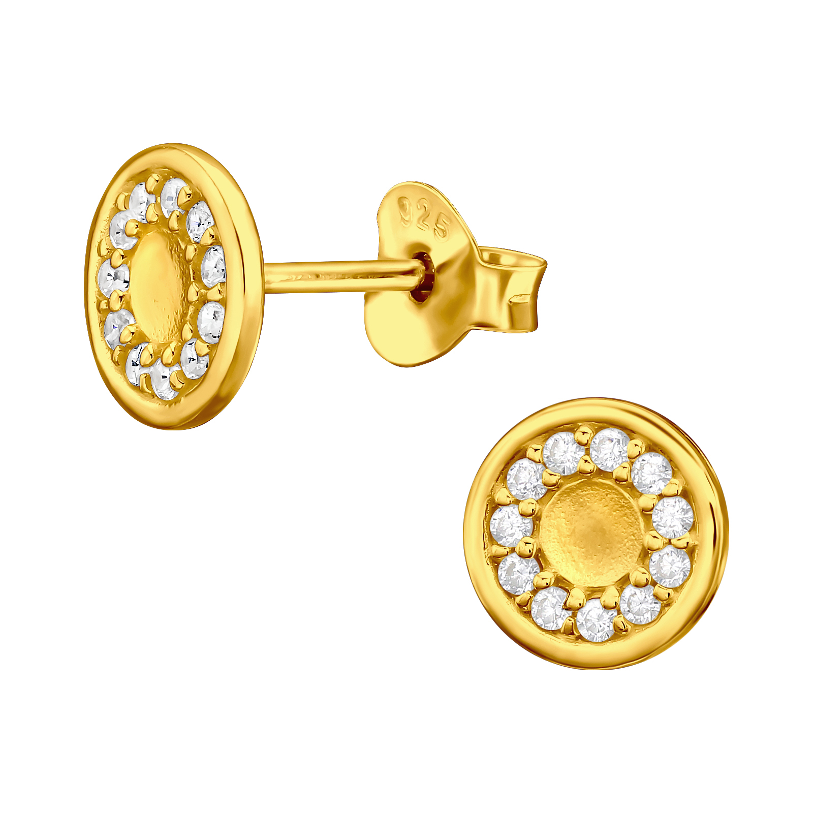 Acesti cercei rotunzi, realizati din argint 925, sunt placati cu aur 24K si protejati de o pelicula anticoroziva, garantand stralucirea si durabilitatea lor. Fiecare cercel este decorat cu 22 de pietre de zirconiu, montate cu grija prin prindere cu ceara, oferind un aspect luxos si rafinat. Sistemul de inchidere cu surub tip garoafa auriu asigura o fixare sigura si confortabila, fiind perfect pentru utilizare zilnica sau ocazii speciale.